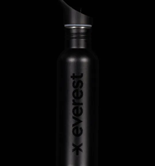 Vattenflaska tillverkad i rostfritt stål. Flaskan är försedd med praktisk ögla som kan användas för fastsättning med exempelvis en karbinhake eller bara för att bära den med ett finger.