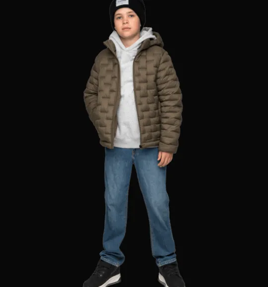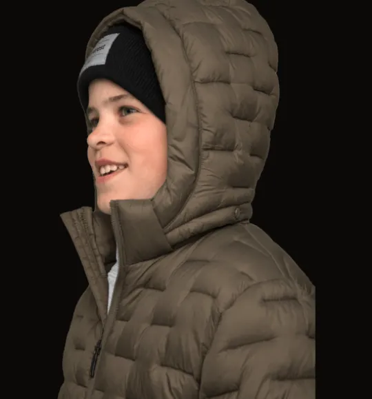 Lätt vadderad linerjacka för barn, med rak passform och med lätt vattenavvisande yttertyg. Den har två sidofickor med dragkedja, och avtagbar huva för barnets säkerhet. Jackan passar bra att använda för sig i lite varmare väder eller som ett värmande lager under en regnjacka eller skaljacka i kallare temperaturer. Vadderingen är gjord i 100% återvunnen polyester och ytbehandlingen är fri från miljöfarliga fluorkarboner.