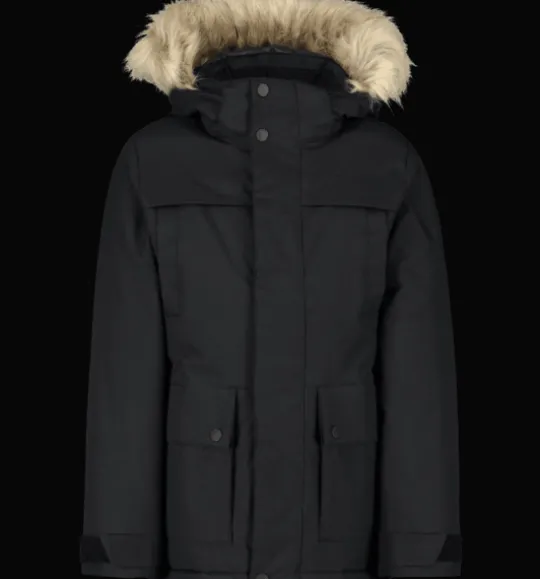 Varmfodrad, vind- och vattenavvisande juniorjacka med värmande, dunliknande vaddering av återvunnen polyester. Jackan har en avtagbar huva med löstagbar syntetpäls och dubbel vindslå vid dragkedjan för att hindra vind och kyla att tränga in. Den är justerbar i både midja och ärmslut för bästa passform, och har reflekterande detaljer vid rygg och ärmslut. Ärmarna har dessutom en invändig elastisk mudd för att skydda mot snö och kyla. Jackan är även försedd med stora, rymliga fickor med mjukt innerfoder, och med ett mjukt foder på insidan av kragen för en varmare, skönare känsla. Jackans ytbehandling är fri från miljöfarliga fluorkarboner och innerfodret är färgat med energibesparande Solution Dye-teknik.