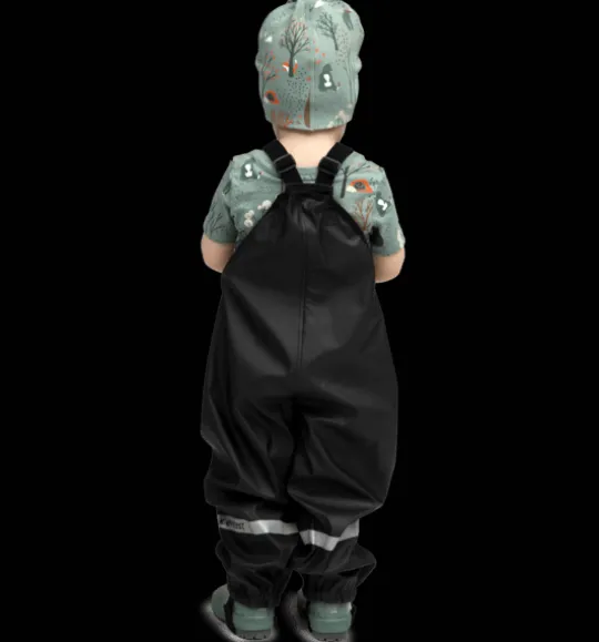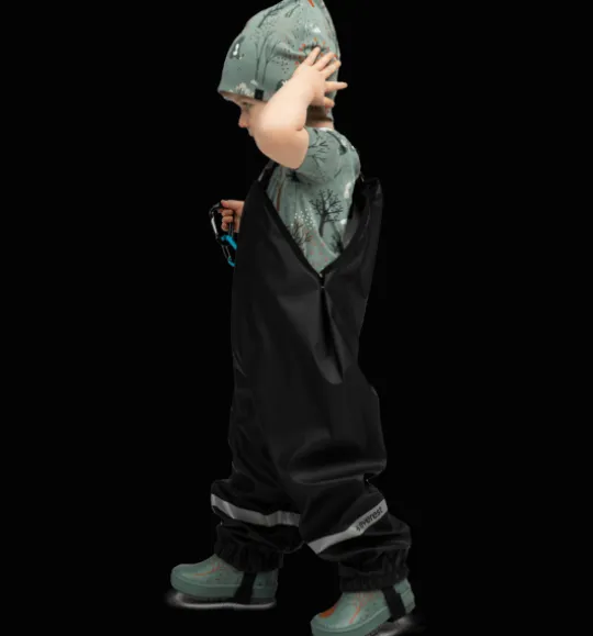 Regnbyxor för barn, gjorda i PU-material och med svetsade sömmar för en helt vattentät konstruktion. Byxorna är justerbara i midjan och har justerbara hängslen för en riktigt bra passform. De har även justerbara, elastiska band som träs under skorna eller stövlarna för att hålla byxbenen på plats och för att hindra vatten från att komma in. Plaggets ytbehandling är fri från miljöfarliga fluorkarboner. Byxorna kan lätt spolas av eller torkas rena med en trasa.