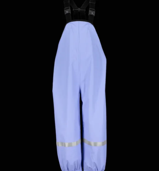 Regnbyxor för barn, gjorda i PU-material och med svetsade sömmar för en helt vattentät konstruktion. Byxorna är justerbara i midjan och har justerbara hängslen för en riktigt bra passform. De har även justerbara, elastiska band som träs under skorna eller stövlarna för att hålla byxbenen på plats och för att hindra vatten från att komma in. Plaggets ytbehandling är fri från miljöfarliga fluorkarboner. Byxorna kan lätt spolas av eller torkas rena med en trasa.