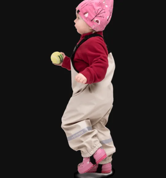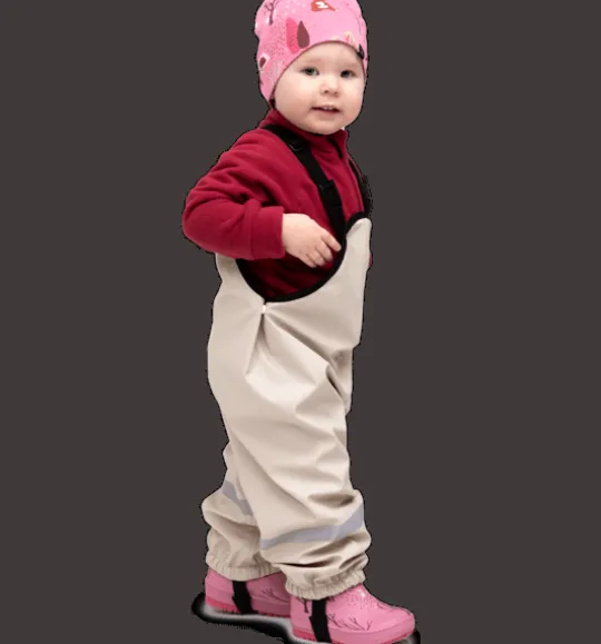 Regnbyxor för barn, gjorda i PU-material och med svetsade sömmar för en helt vattentät konstruktion. Byxorna är justerbara i midjan och har justerbara hängslen för en riktigt bra passform. De har även justerbara, elastiska band som träs under skorna eller stövlarna för att hålla byxbenen på plats och för att hindra vatten från att komma in. Plaggets ytbehandling är fri från miljöfarliga fluorkarboner. Byxorna kan lätt spolas av eller torkas rena med en trasa.