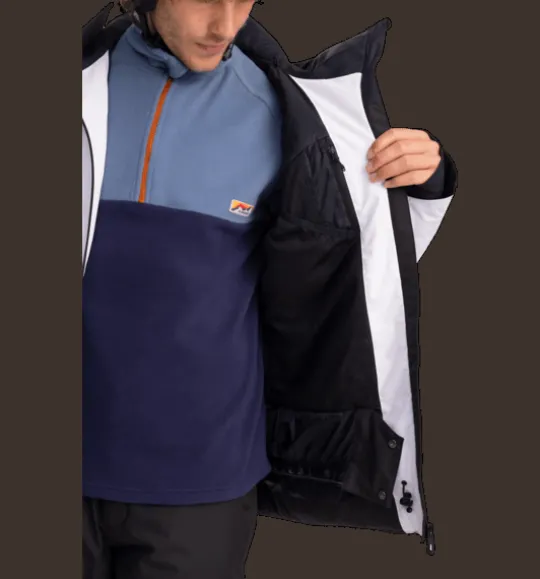 Vadderad skidjacka med vind- och vattentätt yttermaterial och effektiv andasfunktion. Jackan har heltejpade sömmar för optimalt skydd mot regn och snö så att du håller dig garanterat torr hela dagen. Den har också snölås i midja och ärmslut, en hög innerkrage med bekvämt fleecefoder, samt en justerbar, hjälmanpassad huva som skyddar mot vind och kyla. De ventilerande öppningarna under ärmarna ger tillsammans med en meshpanel på ryggen bra temperaturreglering för ökad komfort. Jackan har dessutom flera praktiska fickor; två midjefickor, en bröstficka, två innerfickor och en liftkortsficka på ärmen. Den vattenavvisande impregneringen är helt fri från miljöfarliga fluorkarboner.
