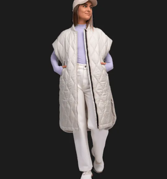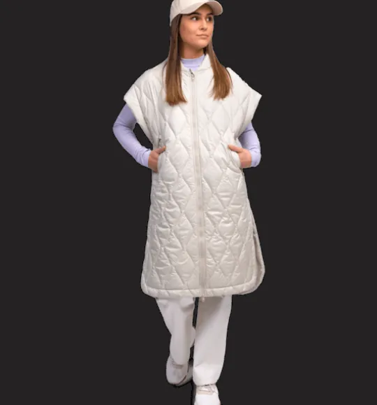 Lång, lätt vadderad väst som passar bra att använda både på våren och på hösten. Den har tvåvägs dragkedja framtill och sprund nertill i sidorna för att du ska kunna röra dig lättare. Västen har även två framfickor med dragkedja. Inuti fickorna finns ett band med reflekterande tryck, smidiga att fälla ut vid behov. Västen är 3-i-1 kompatibel. En ögla bak i nacken gör att du kan koppla ihop din tunnare väst, som ett värmande lager, under en annan jacka. På så sätt kan du skapa kombinationer av plagg som du kan använda under en längre del av säsongen. Plaggets vattenavvisande ytbehandling är fri från miljöfarliga fluorkarboner.