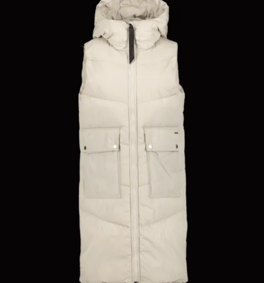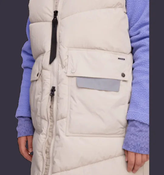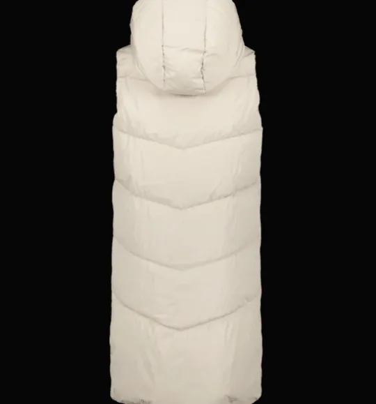 Fina Vest från Everest är en tjockt vadderad lång väst med stor skön huva och tvåvägs dragkedja framtill. Perfekt om du vill öka vidden på västen så att du kan röra dig lättare om du är ute på en snabb promenad eller kliver i och ur bilen. Den har fickor fram som du kommer åt både uppifrån och från sidan, så att du kan få med nycklar och telefon samtidigt som du kan värma händerna om det är kallt. Fickan har ett ficklock som stängs med tryckknapp och är dessutom försedd med en reflekterande detalj som kan fällas ut vid behov. Västen är också designad med ett dekorativt ripsband i sidorna och framme vid dragkedjan. Innanför dragkedjan fram sitter en skyddande vindslå som hindrar vind och kyla att tränga igenom samtidigt som den skyddar mot att dragkedjan fastnar i kläderna innanför. Västens vattenavvisande ytbehandling är fri från PFAS.