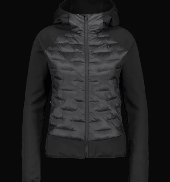 Lätt vadderad jacka med fram- och baksida i ett lätt och smidigt material som är vindtätt och vattenavvisande. Ärmar, huva, nederdel och sidopaneler är gjorda i ett mjukt, följsamt stretchmaterial som är borstat på insidan för värme och komfort. Jackans ytbehandling är fri från miljöfarliga fluorkarboner.