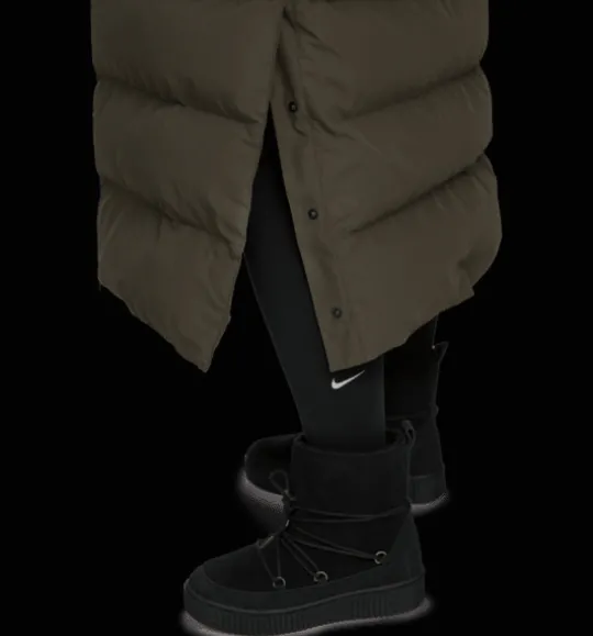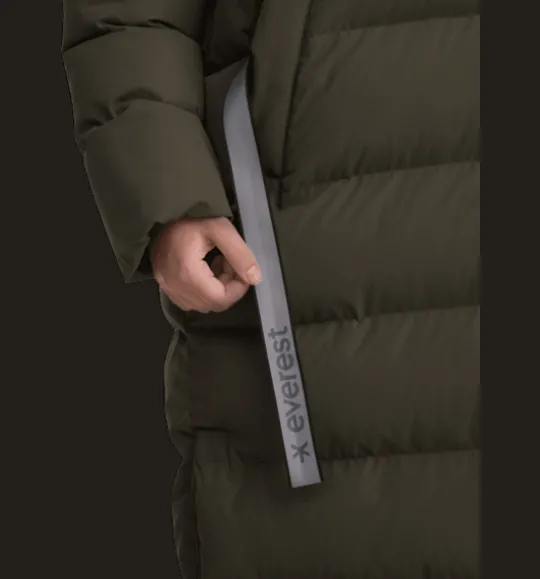 Juneau Coat från Everest är en lång, kanalsydd kappa med TCS Insuloft – en syntetvaddering i 100% återvunnen polyester med dunliknande egenskaper. Den har ett yttertyg som är vind- och vattentätt men har inte tejpade sömmar så se upp med för hård, långvarig nederbörd. Jackan har en något lösare passform som gör att du får plats med en tjockare tröja under när det är riktigt kallt ute. Den har tvåvägs dragkedja framtill och sprund nertill i sidorna som öppnas och stängs med tryckknappar. Perfekt om du vill öka vidden på jackan så att du kan röra dig lättare om du är ute på en snabb promenad eller kliver i och ur bilen. Den är också försedd med en stor skön huva och med framfickor med mjukt innerfoder för en varmare känsla. Inuti fickorna finns dessutom ett band med reflekterande tryck, smidigt att fälla ut vid behov. Kappan är 3-i-1 kompatibel. Ett fäste bak i nacken gör att du kan koppla ihop en tunnare lättviktsjacka eller väst under den här höst- och vinterjackan. På så sätt kan du skapa kombinationer av plagg som du kan använda under en längre del av säsongen. Plaggets vattenavvisande ytbehandling är fri från PFAS.