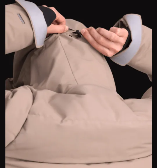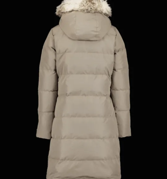 Kanalsydd dunkappa med värmande fyllning av 70% dun och 30% fjäder samt dunliknande syntetvaddering av återvunnen polyester i huvan och längst ner på jackan och ärmarna. Jackan har vind- och vattentätt yttertyg men har inte tejpade sömmar så se upp med för hård, långvarig nederbörd. Den har en smidig, tvåvägs dragkedja framtill och en stor skön huva med avtagbar syntetpäls som gör att du kan variera utseendet på jackan. Kappan är också försedd med två utvändiga fickor som stängs med dragkedja och som har mjuk borstad trikå på insidan för en varmare känsla. I ärmsluten sitter en elastisk innermudd med tumhål och en kant i reflekterande material som kan vikas fram vid behov. Kappan är 3-i-1 kompatibel. Ett fäste bak i nacken gör att du kan koppla ihop en tunnare lättviktsjacka eller väst under den här jackan. På så sätt kan du skapa kombinationer av plagg som du kan använda under en längre del av säsongen. Plaggets vattenavvisande ytbehandling är fri från miljöfarliga fluorkarboner.