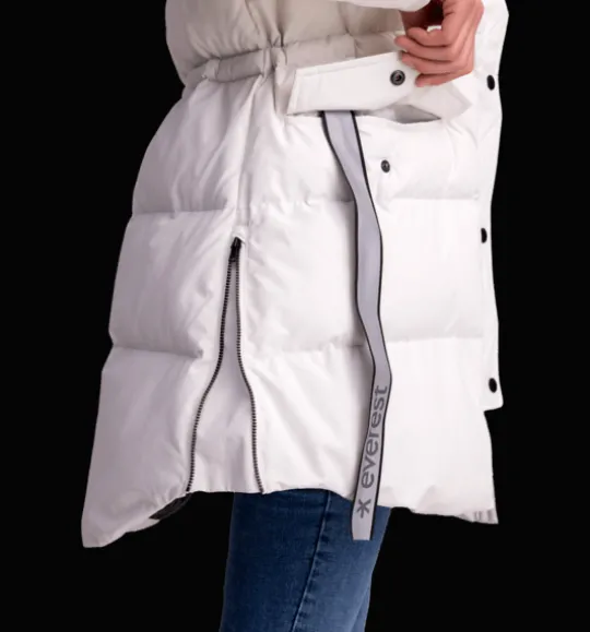 Warm Parka från Everest är en kanalsydd, puffig parka med värmande TCS Insuloft, en syntetvaddering i 100% återvunnen polyester med dunliknande egenskaper. Den har ett yttertyg som är vind- och vattentätt men har inte tejpade sömmar så se upp med för hård, långvarig nederbörd. Jackan har en skönt värmande huva och är justerbar i midjan så att du kan variera din stil – antingen en rakare eller mera timglasformad siluett. Jackan är också försedd med tvåvägs dragkedja fram och med sprund med dragkedja nertill i sidorna, perfekt att öppna upp för en vidare passform så att du kan röra dig lättare om du är ute på en snabb promenad eller kliver i och ur bilen. Det finns också en skyddande vindslå både framför och innanför dragkedjan fram. Den hindrar vind och kyla från att tränga igenom samtidigt som den skyddar plaggen under jackan från att fastna i dragkedjan. Jackan har även elastiska innermuddar i ärmsluten samt flera praktiska fickor. Sidofickorna har mjuk borstad trikå på insidan för en varmare känsla. Inuti ena fickan finns dessutom ett band med reflekterande tryck, smidigt att fälla ut vid behov. Parkan är 3-i-1 kompatibel. Ett fäste bak i nacken gör att du kan koppla ihop en tunnare lättviktsjacka eller väst under den här jackan. På så sätt kan du skapa kombinationer av plagg som du kan använda under en längre del av säsongen.