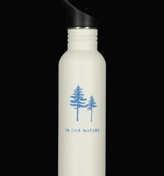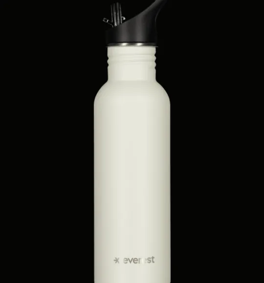 Vattenflaska tillverkad i rostfritt stål. Flaskan är försedd med praktisk ögla som kan användas för fastsättning med exempelvis en karbinhake eller bara för att bära den med ett finger.