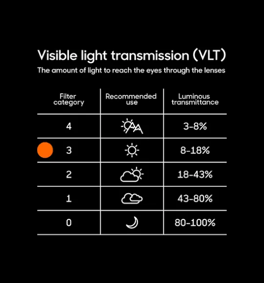 - Lins: Summit Vision är en kategori 3-lins som passar för soliga dagar. Linsen dämpar ljusgenomsläppet till 8-18%. Den är även försedd med en Revo-coating.