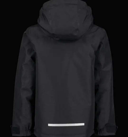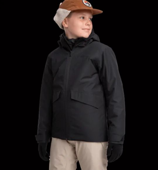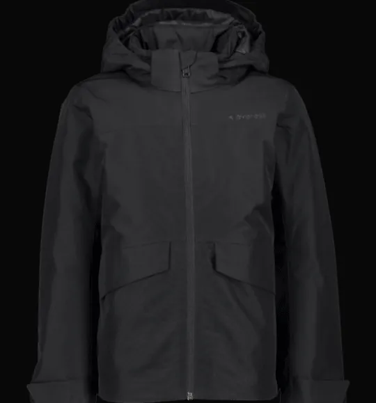 Varmfodrad juniorjacka med vind- och vattentätt yttertyg som har mycket bra andasförmåga. Den har värmande polyestervaddering, mjukt innerfoder och heltejpade sömmar för en helt vattentät konstruktion. Jackans huva är avtagbar för barnet säkerhet och på insidan av kragen finns ett mjukt foder för en varmare, skönare känsla. Jackan är också försedd med reflekterande detaljer, sidofickor med ficklock och med en skyddande vindslå bakom dragkedjan framtill för att hindra vind och kyla att tränga igenom. Den är justerbar i både ärmslut och nederkant för en personlig passform och för att hålla snö och kyla ute.