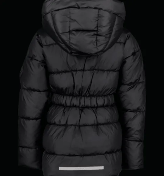 Fin vinterjacka med formad passform och skönt värmande, dunliknande vaddering. Den har lätt vattenavvisande yttertyg och dragkedja med knappslå framför för att skydda mot kyla och vind. Jackan är också utrustad med avtagbar huva, resår i midjan och sidofickor med dragkedja. Ärmsluten är försedda med en praktisk utfällbar detalj i reflekterande material och med en ribbad invändig mudd för att hindra vind och kyla att komma in.