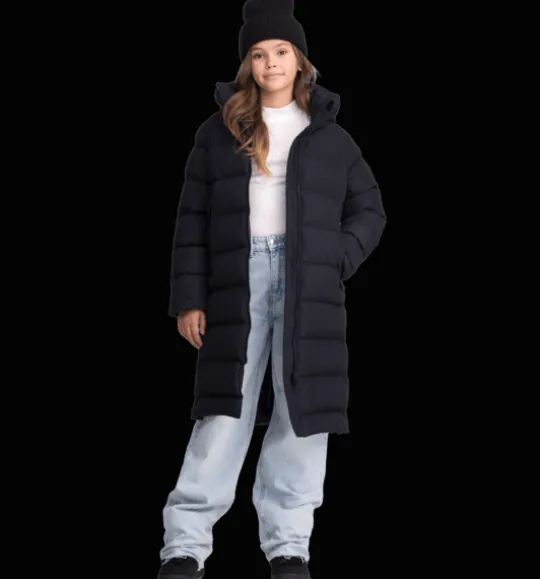 J Grando Coat från Everest är en varmfodrad höst- och vinterkappa för junior. Den är gjord i en längre modell för skön värme och har en nättare, lätt formad passform. Jackan har värmande vaddering av återvunnet material och vattentätt yttertyg (10 000 mm), men har inte tejpade sömmar så se upp med för hård, långvarig nederbörd. Den är försedd med en avtagbar huva för ökad säkerhet och har sprund med tryckknappar nertill i sidorna, perfekt att öppna upp så att du kan röra dig lättare. Jackan har också framfickor med dragkedja och mjukt innerfoder samt ett reflekterande tryck nertill på ryggen. På insidan av ärmsluten finns dessutom en kant i reflekterande material, smidig av vika fram vid behov. Plaggets vattenavvisande ytbehandling är fri från PFAS.