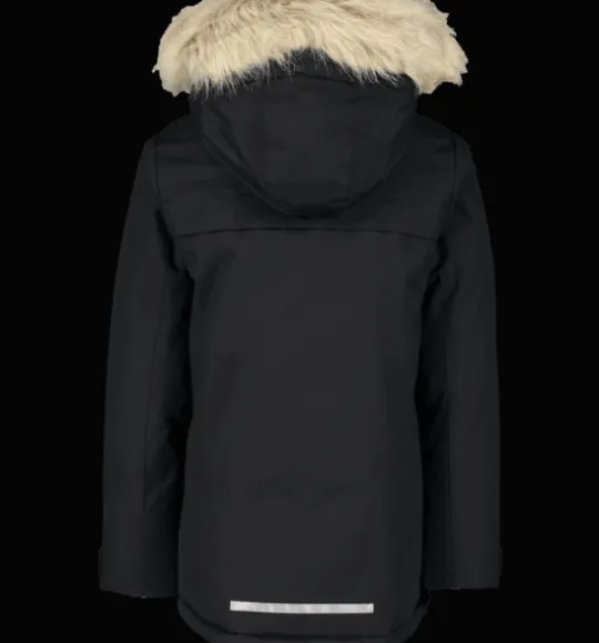 Varmfodrad, vind- och vattenavvisande juniorjacka med värmande, dunliknande vaddering av återvunnen polyester. Jackan har en avtagbar huva med löstagbar syntetpäls och dubbel vindslå vid dragkedjan för att hindra vind och kyla att tränga in. Den är justerbar i både midja och ärmslut för bästa passform, och har reflekterande detaljer vid rygg och ärmslut. Ärmarna har dessutom en invändig elastisk mudd för att skydda mot snö och kyla. Jackan är även försedd med stora, rymliga fickor med mjukt innerfoder, och med ett mjukt foder på insidan av kragen för en varmare, skönare känsla. Jackans ytbehandling är fri från miljöfarliga fluorkarboner och innerfodret är färgat med energibesparande Solution Dye-teknik.