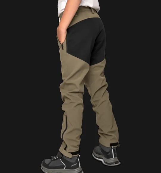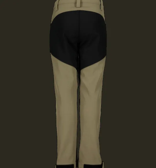 Funktionsbyxor i slitstarkt, stretchigt softshell-material med mjuk och värmande fleece på insidan. De passar bra att använda som friluftsbyxor/vandringsbyxor under kyliga höstdagar. Byxorna har knapphålsresår i midjan för justerbar passform och hällor för bälte. De är förstärkta med vattenavvisande material vid rumpan för att bättre tåla tuffa utomhusäventyr. Byxorna har också tre fickor med dragkedja och förböjda knän för bättre rörlighet. Bensluten går att justera med kardborre och har också en dragkedja i sidan för enklare på- och avtagning. Plagget är fritt från miljöfarliga fluorkarboner.