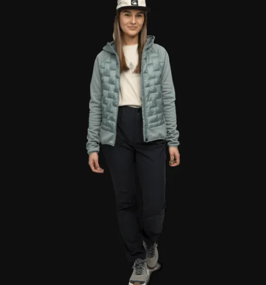 Lätt vadderad jacka med fram- och baksida i ett lätt och smidigt material som är vindtätt och vattenavvisande. Ärmar, huva, nederdel och sidopaneler är gjorda i ett mjukt, följsamt stretchmaterial som är borstat på insidan för värme och komfort. Jackans ytbehandling är fri från miljöfarliga fluorkarboner.
