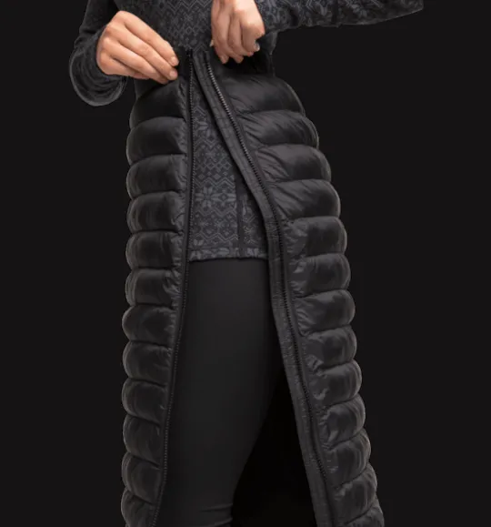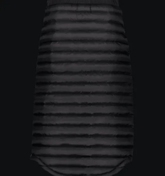 Kanalsydd, lätt vadderad täckkjol i längre modell. Bra att använda över kjol, tights eller byxor för extra värme. Den passar lika bra till vardags som att använda till mer aktiva aktiviteter, till exempel vid promenader för att få lite extra värme över rumpa och ben. Kjolen är elastisk baktill i midjan för bästa passform. Den har en tvåvägs dragkedja i sidan som gör den lätt att ta på och av. Du kan dessutom öka vidden nertill med hjälp av dragkedjan, så att du kan röra dig lättare om du är ute på en snabb promenad eller kliver i och ur bilen. Plaggets vattenavvisande ytbehandling är fri från PFAS.