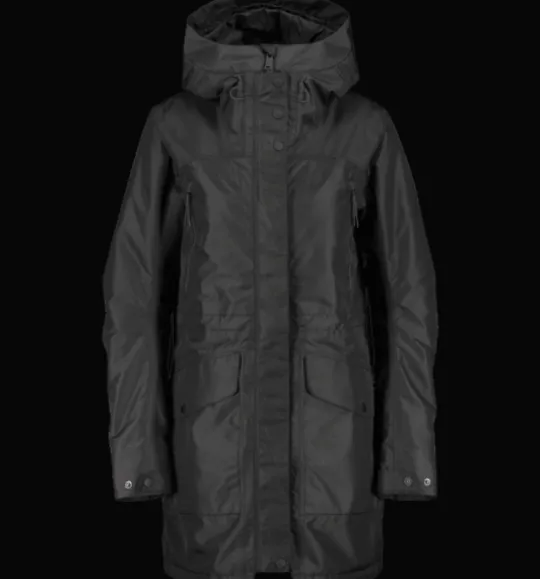 Vind- och vattentät parka i något längre modell. Med lätt vaddering i återvunnen polyester, dragsko i midjan och huva med justering både fram och bak för en passform som sluter tätt och stänger ute vind och vatten. Jackan har ett mjukt foder framtill på insidan av kragen som värmer lite extra och ger en mjuk och skön känsla. Den har en skyddande vindslå framför dragkedjan fram, som stängs med tryckknappar och som hindrar vind och kyla att komma in. Även innanför dragkedjan finns en vindslå, som håller vind och kyla ute och som skyddar plaggen under från att fastna i dragkedjan. Ärmsluten är justerbara med knappstängning och har även en praktisk utfällbar detalj i reflekterande material. Jackan har dessutom flera fickor — två bröstfickor med dragkedja, en innerficka i mesh samt två midjefickor med ficklock och mjukt innerfoder. Jackan är 3-i-1 kompatibel. Ett fäste bak i nacken gör att du kan koppla ihop en tunnare lättviktsjacka med den här jackan. På så sätt kan du skapa kombinationer av plagg som du kan använda under en längre del av säsongen. Plagget är fritt från miljöfarliga fluorkarboner och har innerfoder färgat med energibesparande Solution Dye-teknik.