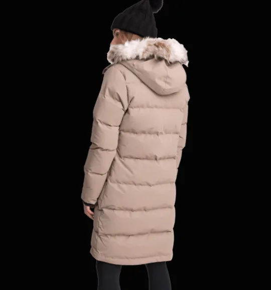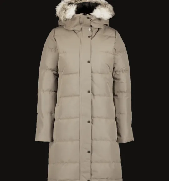 Kanalsydd dunkappa med värmande fyllning av 70% dun och 30% fjäder samt dunliknande syntetvaddering av återvunnen polyester i huvan och längst ner på jackan och ärmarna. Jackan har vind- och vattentätt yttertyg men har inte tejpade sömmar så se upp med för hård, långvarig nederbörd. Den har en smidig, tvåvägs dragkedja framtill och en stor skön huva med avtagbar syntetpäls som gör att du kan variera utseendet på jackan. Kappan är också försedd med två utvändiga fickor som stängs med dragkedja och som har mjuk borstad trikå på insidan för en varmare känsla. I ärmsluten sitter en elastisk innermudd med tumhål och en kant i reflekterande material som kan vikas fram vid behov. Kappan är 3-i-1 kompatibel. Ett fäste bak i nacken gör att du kan koppla ihop en tunnare lättviktsjacka eller väst under den här jackan. På så sätt kan du skapa kombinationer av plagg som du kan använda under en längre del av säsongen. Plaggets vattenavvisande ytbehandling är fri från miljöfarliga fluorkarboner.